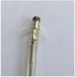 eine Schrittmachersonde mit Widerhaken, die im rechten Ventrikel eingeführt wird
