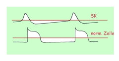 Deutlich ist zu sehen, dass die Schrittmacherzelle (SK für Sinusknoten) im Gegensatz zur normalen Herzzelle gleich nach der Repolarisation beginnt,