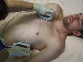 Beim Defibrillieren werden die Paddles zur Verringerung des Widerstandes fest angedrückt.