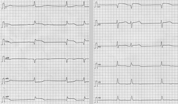 Das EKG zeigt in den Ableitungen II, III, aVF die typische Hebungen des Hinterwandlinfarktes.