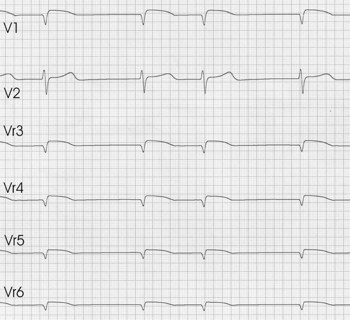 V1 zeigt die Beteiligung des rechten Ventrikels. Die deutlichen Hebungen in den erweiterten Ableitungen der rechten Brustwand