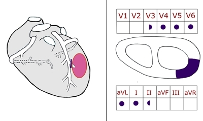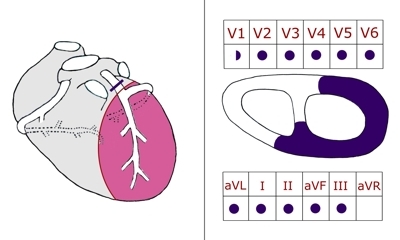 Die Vorder- und Seitenwand des linken Ventrikels und der vordere Abschnitt des Ventrikelseptums sind betroffen.