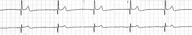 In diesem Streifen stellt man sich die Frage, ob das ein AV-Ersatzrhythmus ist, die Frequenz (300 : 7) ergibt ca. 42/min. Problem: Wenn man das P nicht sieht, bedeutet das noch nicht, dass es nicht existiert.