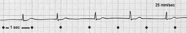 Der QRS- Komplex ist unverändert schmal und gleich geformt wie beim Sinusrhythmus, nur die P- Welle fehlt. Manchmal wird der Vorhof auch retrograd