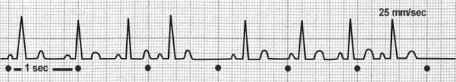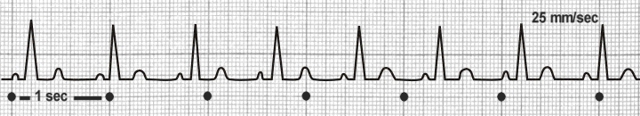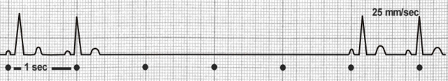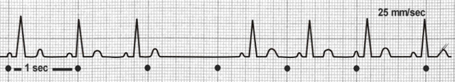 Ein Sinu-Atrialer Block wird dann angenommen, wenn der Rhythmus im doppelten oder mehrfachen P-P-Abstand wiedereinsetzt.