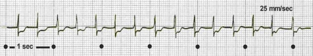 (Rhythmus kommt aus dem Vorhof, ein Tawaraschenkel blockiert aber, daher Bild wie bei Schenkelblock.