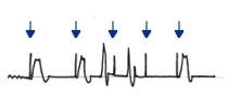 die Ventrikelsonde stimmuliert, der Ventrikel schlägt dann zeitversetzt synchron(3+4+5.QRS) |
